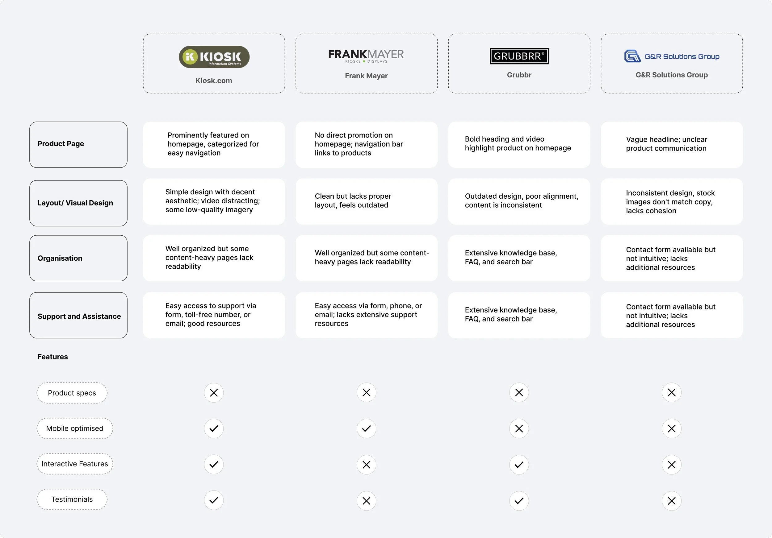 Competitor websites, like Kiosk.com and Grubbrr, immediately communicated their offerings clearly and built trust with cohesive visuals. Their support sections were helpful and easy to use. Meanwhile, our site lacked product specifications, testimonials, and interactive elements—key factors that help customers confidently choose their products.